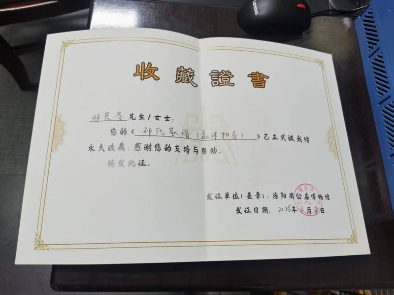 今天给洛阳周公庙捐赠邢氏家谱,周公庙给邢少锋发了收藏证书