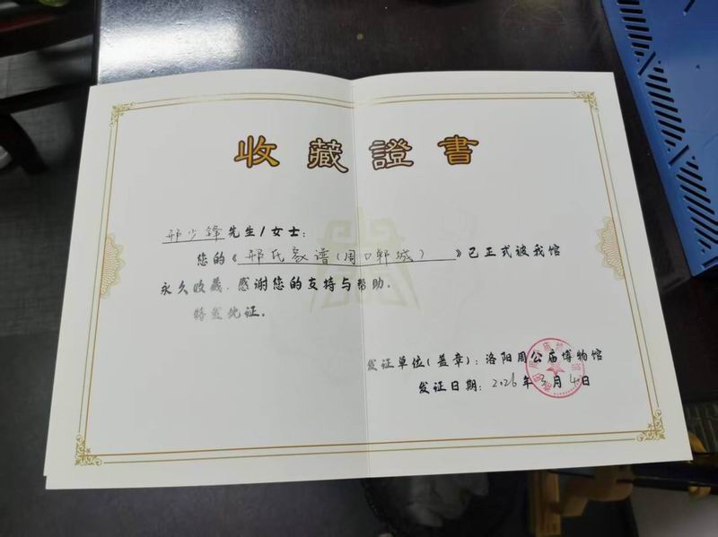 今天给洛阳周公庙捐赠邢氏家谱,周公庙给邢少锋发了收藏证书